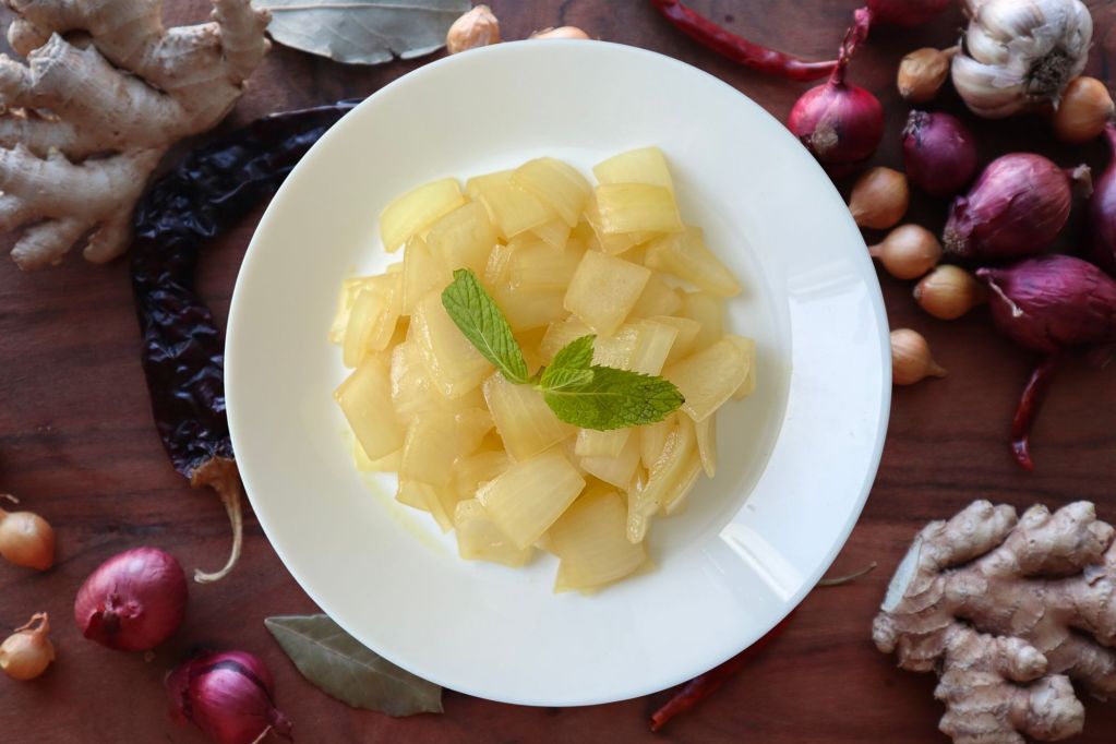 White onions sautéed in vinegar and oil create a tangy, savory side dish with a perfect balance of flavors. The mild sweetness of the onions pairs beautifully with the acidity of the vinegar, making it a delightful accompaniment 🍛