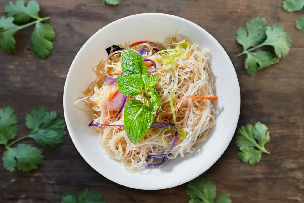 This dish combines light and chewy vermicelli noodles with organic savory tofu. Fresh mint leaves and noodle will perfectly complementing the dish. Garnished with crunchy bean sprouts and onions, and complemented by peanuts and fried shallots, it’s dressed with a tangy lemon-garlic soy sauce. The peanuts are served separately—add them if you prefer! 🍛